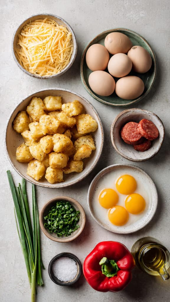 There are mornings when you want something cozy, filling, and just a little indulgent, and this dish delivers exactly that. Crispy potato bites layered with fluffy eggs, savory sausage, melty cheese, and pops of colorful peppers come together in one basket of pure breakfast comfort. Trust me, you’re going to love this, especially when the aroma starts filling the kitchen.