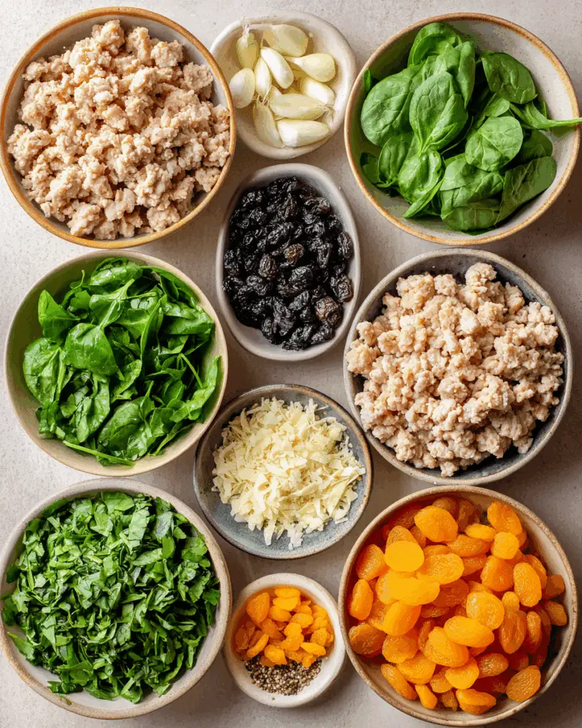- In a large mixing bowl, combine ground pork, ground turkey (or chicken), minced garlic, spinach, basil, diced apricots, salt, and pepper. Mix until just combined.