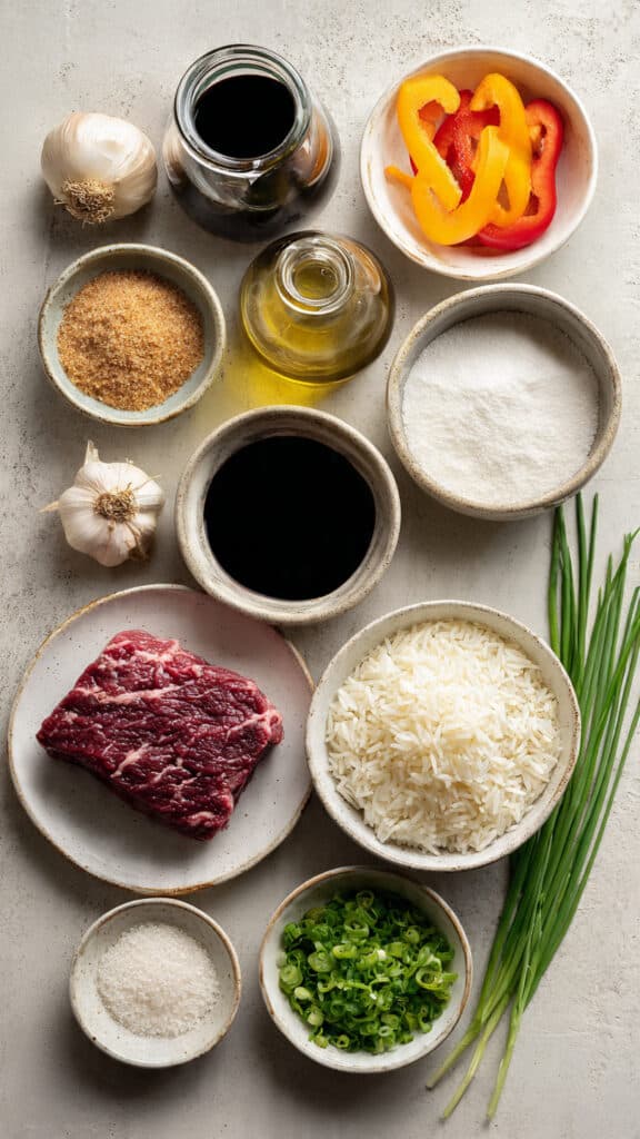 Serve in wide bowls with rice spread evenly and steak layered on top. Finish with evenly scattered chives for vibrant color contrast.