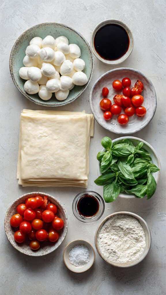 The puff pastry provides a crispy, buttery crunch, while mozzarella melts slightly and becomes creamy. Cherry tomatoes burst with juiciness, and fresh basil adds herbal brightness. The balsamic glaze balances the rich flavors with subtle sweetness and acidity.
