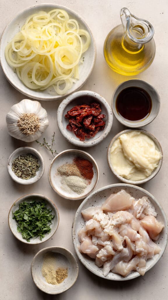Rich, creamy, and full of flavor, this baked caramelized onions and chicken dish features tender chicken thighs, sweet onions, sun-dried tomatoes, and a hint of balsamic — all brought together in a silky cream sauce. A comforting meal that’s perfect for weeknights or impressing guests.