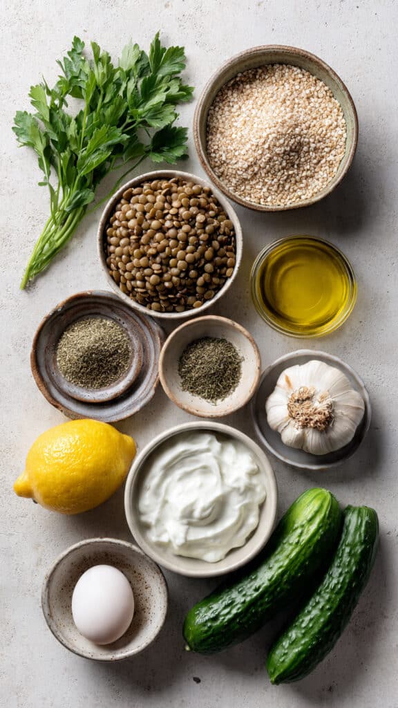 - Combine Ingredients: Lightly pulse the lentils in a food processor, then mix with breadcrumbs, egg, minced garlic, parsley, oregano, cumin, salt, pepper, and olive oil until evenly combined.