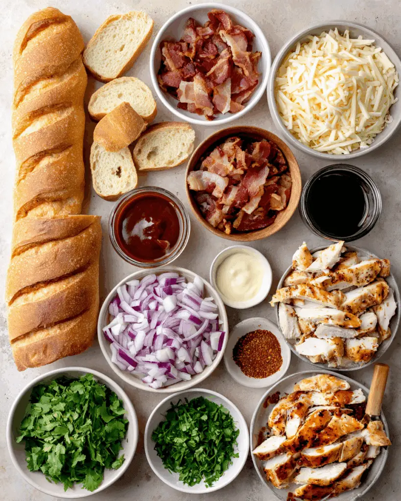Prep Your Ingredients: Slice the French bread in half lengthwise, dice or shred chicken, slice red onion thinly, and cook bacon until crispy.