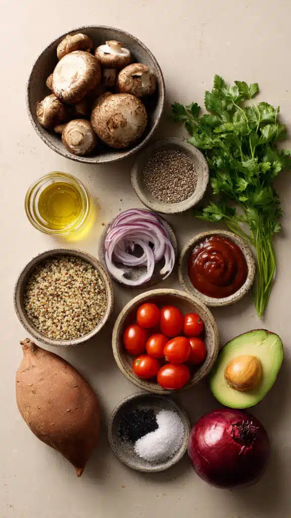 You know those meals that somehow feel both comforting and energizing? This is one of them. The smoky mushrooms give you that rich, almost grilled flavor, while the roasted sweet potatoes add a soft sweetness that balances everything out. Then you get the creamy avocado, the juicy pop of cherry tomatoes, and the sharp bite of red onion. It is layered, vibrant, and honestly, it feels like something you would order at your favorite healthy café, but better because you made it yourself.