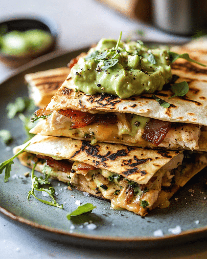 Quesadillas just got a bold, flavor-packed upgrade! These Black Pepper Chicken and Salami Quesadillas are the perfect fusion of crispy tortillas, juicy seasoned chicken, smoky salami, and gooey melted cheeseโall paired with a creamy, herby Avocado Basil Ranch that takes things to the next level. Whether youโre making a quick weeknight dinner, a game-day snack, or a fun meal to share, this recipe is guaranteed to impress.