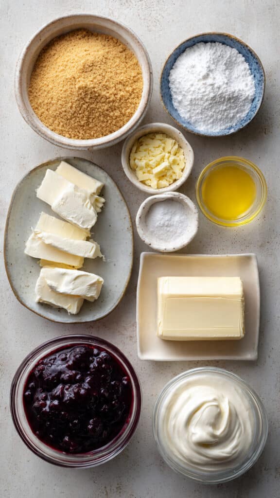 - Blueberry Pie Filling or Compote: 1 ½ cups, spooned on top for fruity sweetness and color.