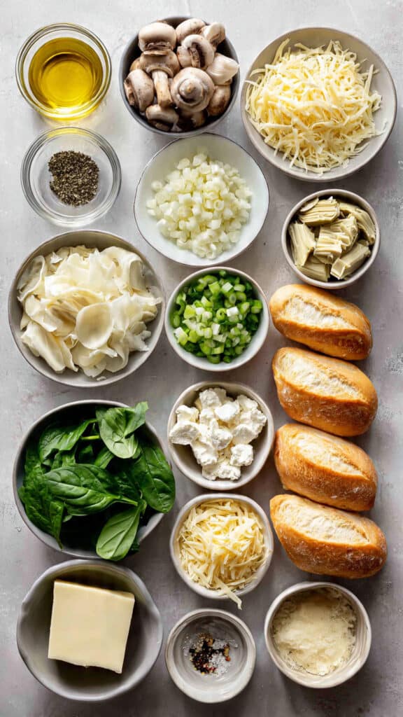 Ingredients in Cheesy Spinach Artichoke & Mushroom Stuffed Baguette