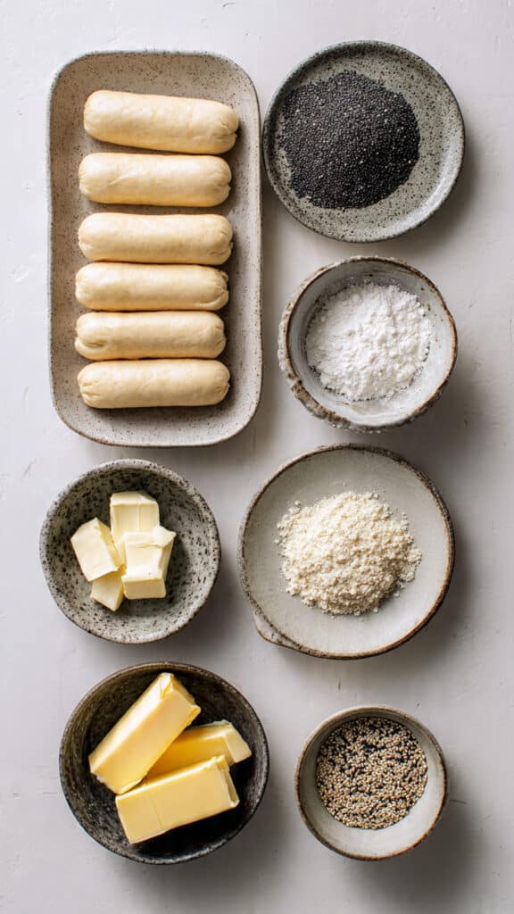 - Arrange wrapped sausages on the baking sheet, brush with melted butter, and sprinkle with sesame and poppy seeds.