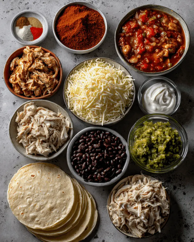 - In a large bowl, combine shredded chicken, cheese, green chiles, chili powder, salt, cumin, garlic powder, onion powder, and black pepper. Mix well.