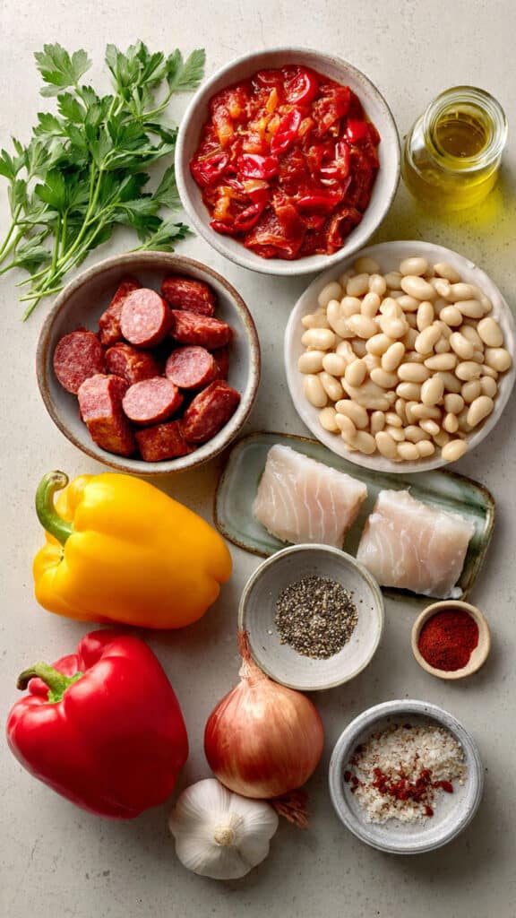 A bold and comforting one pan dish featuring tender cod fillets simmered in a smoky tomato sauce with sliced chorizo, creamy white beans, and sweet bell peppers. Rustic, hearty, and packed with Mediterranean inspired flavor.