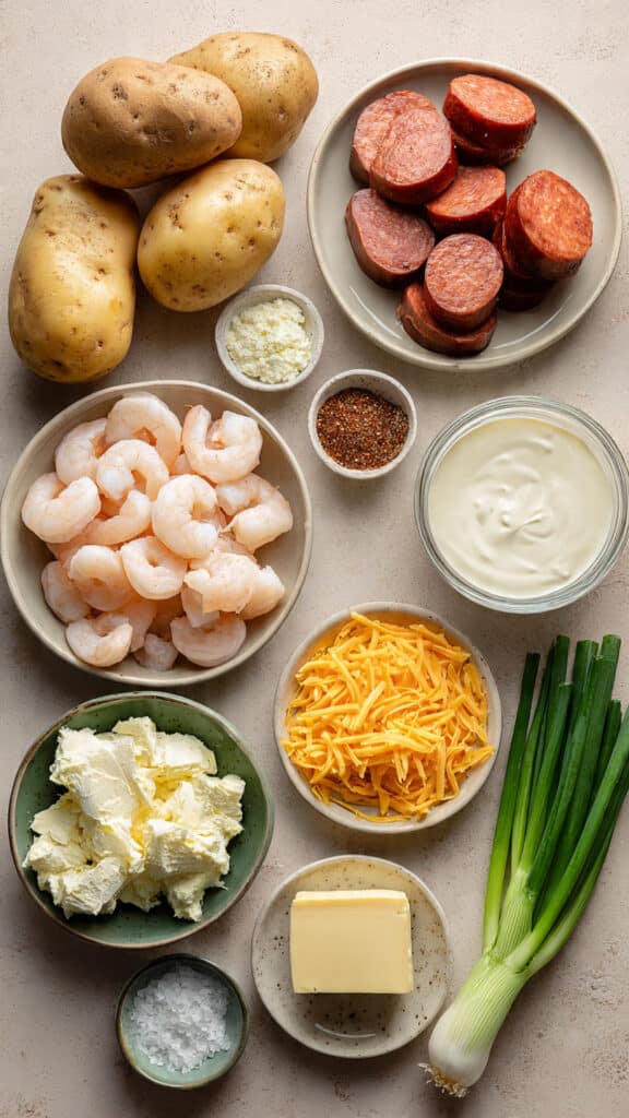 - Finishing Touches: Slice open the baked potatoes and fluff the insides with a fork. Spoon the creamy cheese sauce inside, then top generously with sausage, shrimp, and sliced green onions.