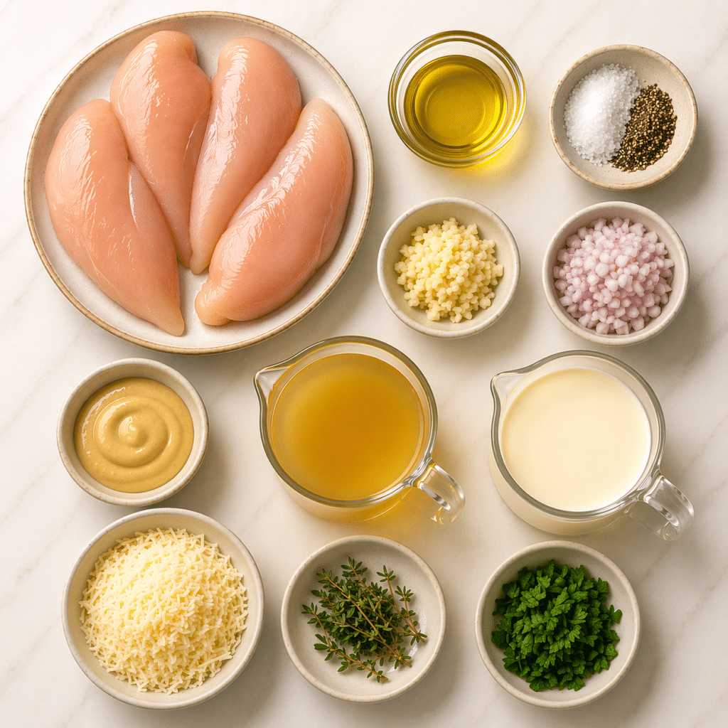 - Combine Ingredients: Pat the chicken breasts dry, then season both sides evenly with the salt and black pepper. In a small bowl, stir together the Dijon mustard, heavy cream, and chopped thyme so the sauce base is ready to go.