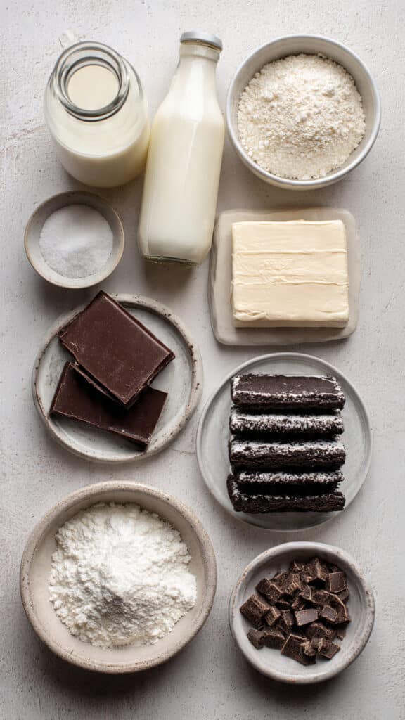 - Heavy Cream: 2 1/2 cups, divided, whipped for fluffiness and used in the chocolate topping.