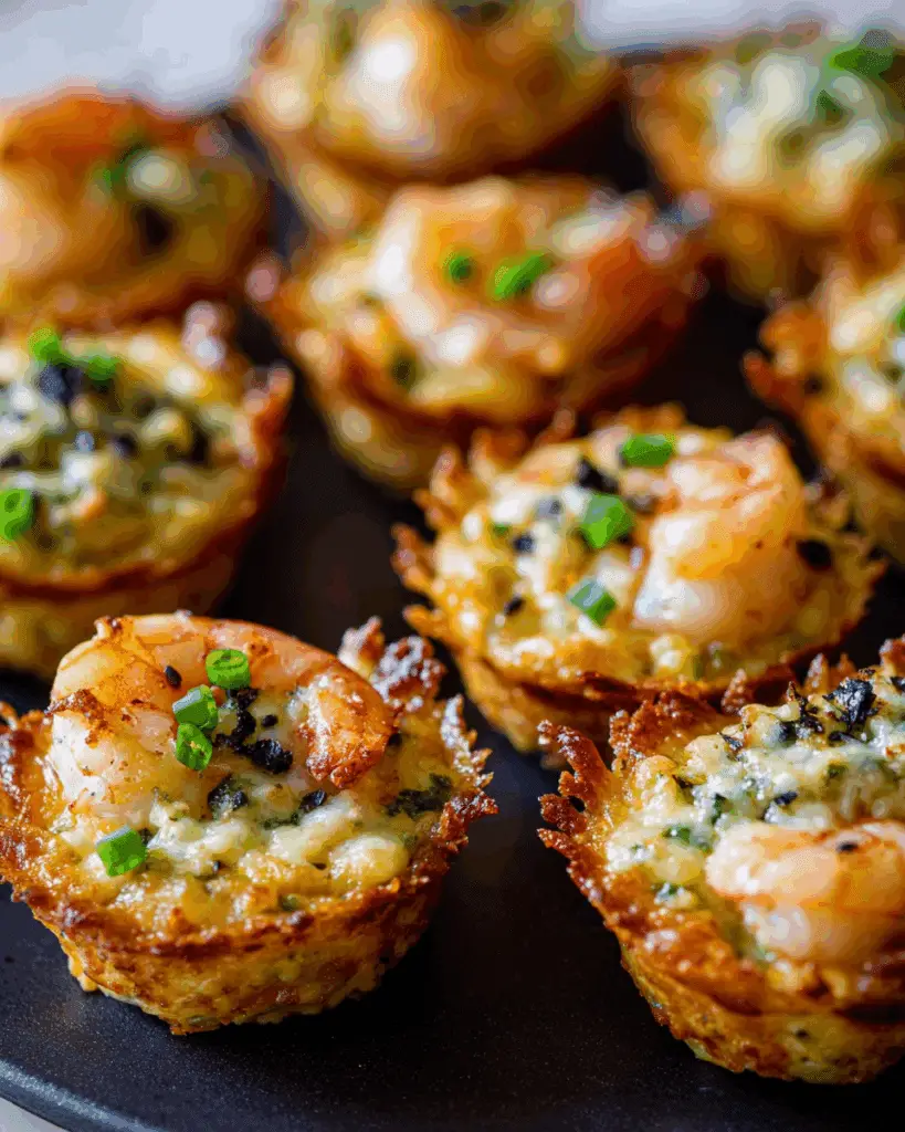 Crispy Cajun Shrimp Cups are a flavorful appetizer featuring shrimp marinated in a zesty Creole-inspired sauce, baked in delicate phyllo shells, and topped with a creamy, cheesy, and slightly tangy topping with a sprinkle of sesame seeds. Perfect for parties or gatherings.
