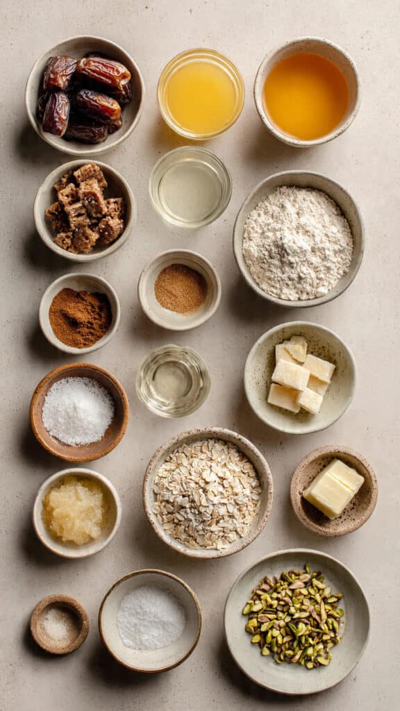 Chewy, spiced Date Bars with a fragrant filling of dates, orange flower water, and citrus zest, topped with a crumbly oat crust and crunchy pistachios. Perfect for snacks, dessert, or gifting.
