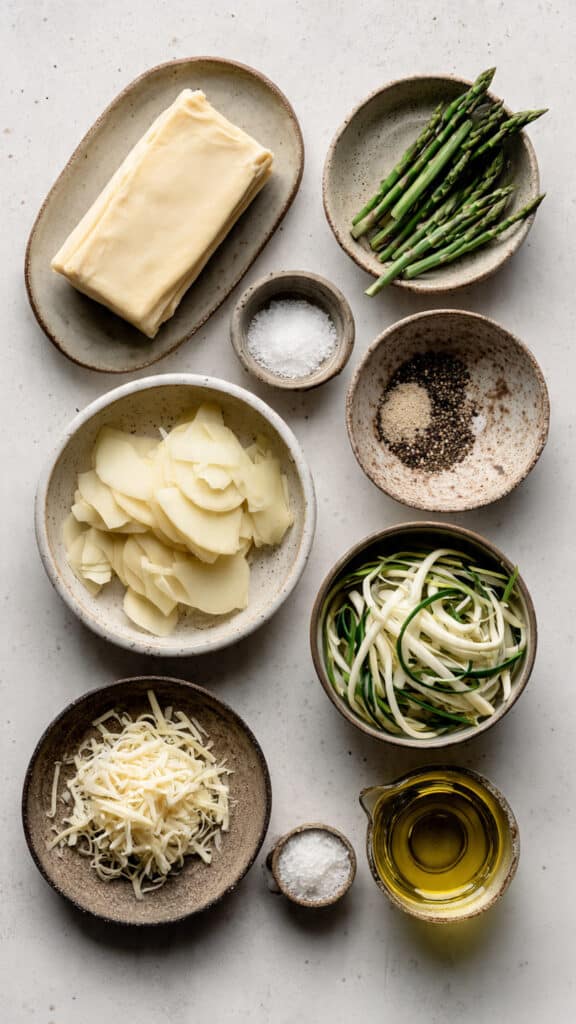 A rustic potato and asparagus tart with golden flaky puff pastry, tender potato slices, fresh asparagus ribbons, and melted cheese. This simple yet elegant tart is perfect for brunch or a light meal.