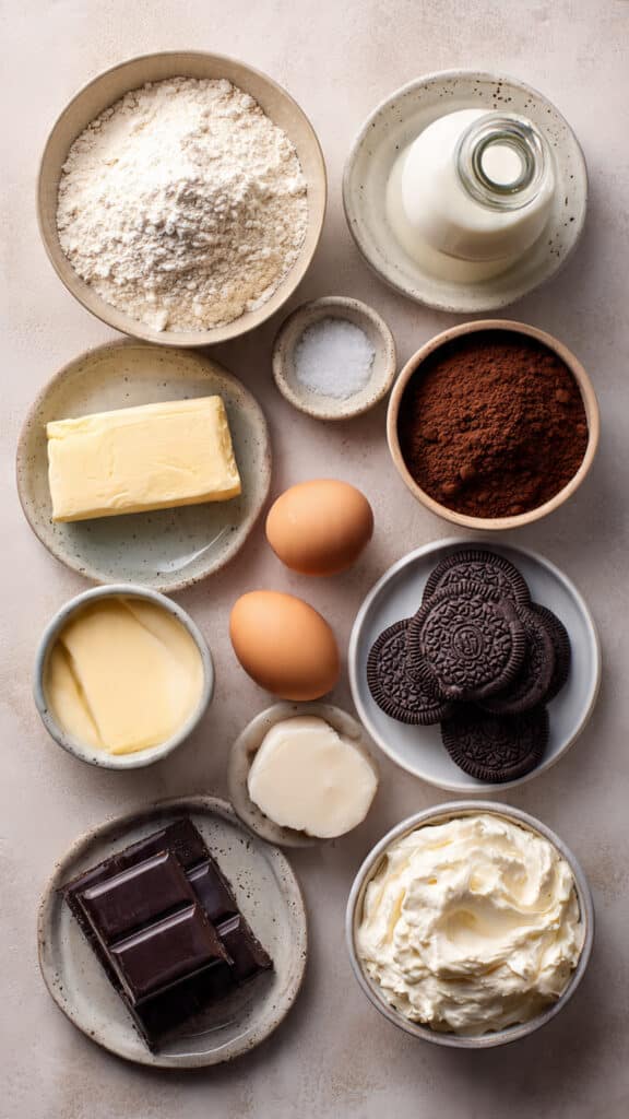 - Finishing Touches: Heat heavy cream until just simmering, then pour over chopped dark chocolate. Let sit for 2 minutes, then stir until smooth. Spoon ganache over cooled cakes and allow to set slightly. Top with whipped cream and half a chocolate sandwich cookie.
