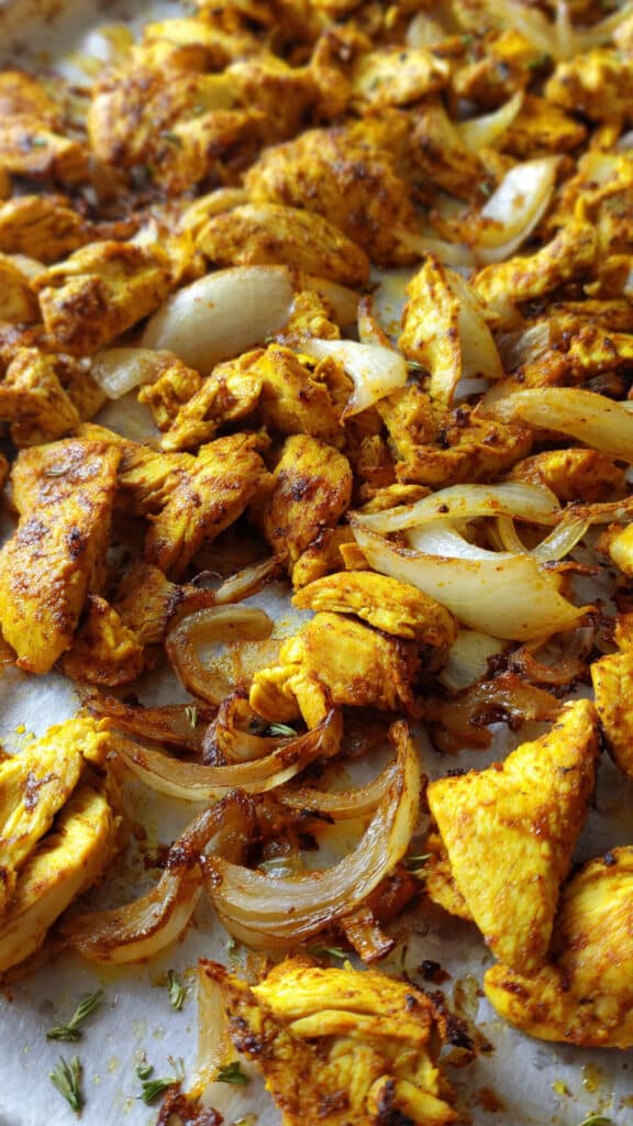 A flavorful one-pan chicken dish inspired by Middle Eastern shawarma spices. Juicy roasted chicken breast cubes and caramelized onions, all seasoned with a bold spice blend and roasted to perfection.