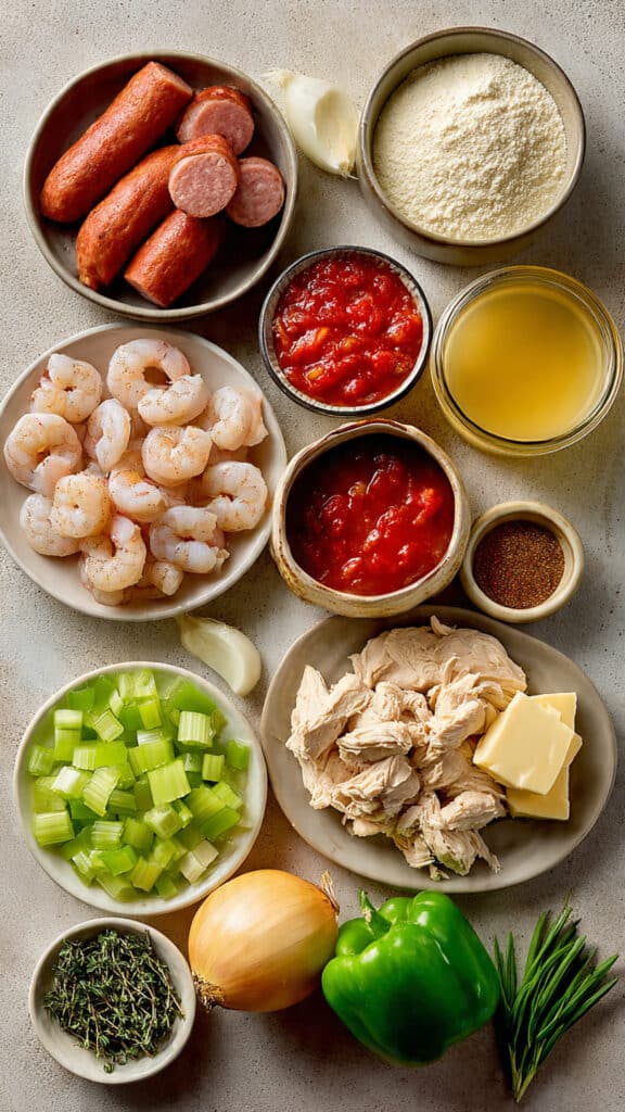 Roux: The mixture of flour and butter cooked until deep golden brown creates the signature thick, silky texture. It brings nutty richness that defines gumbo.