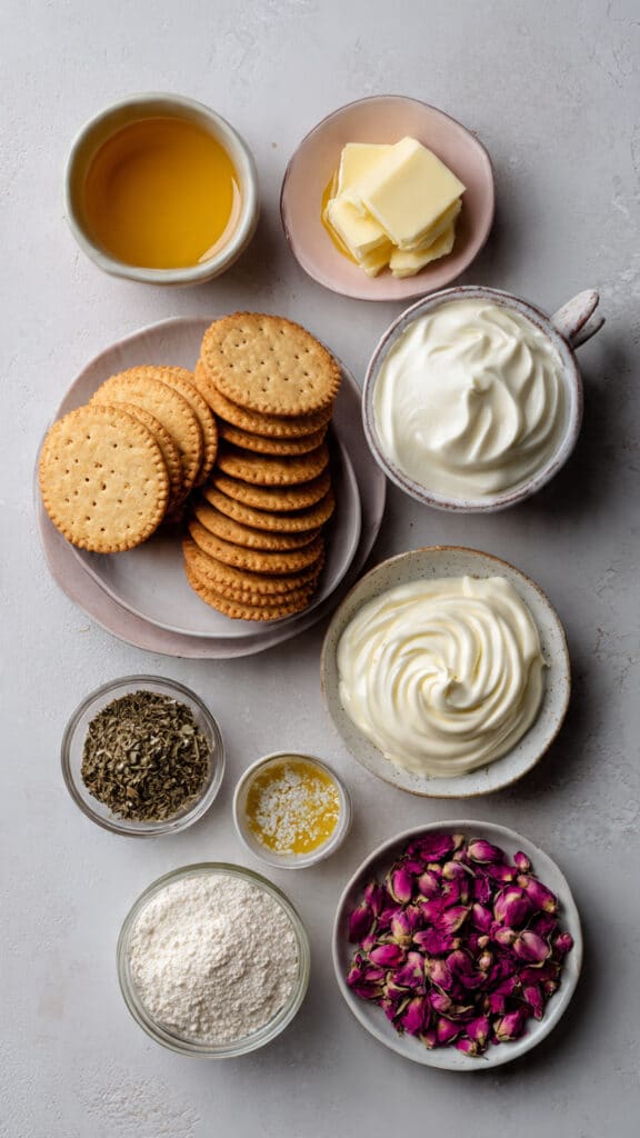 - Digestive Biscuits: 18 biscuits. Crushed to form a buttery, slightly sweet crust.