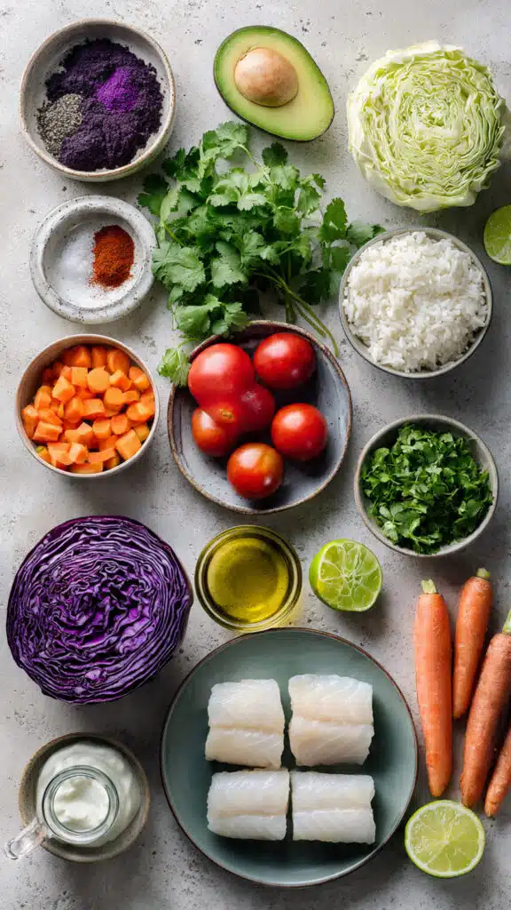 - Assemble the Dish: Cook the seasoned fish for 3 to 4 minutes per side until opaque and flaky. Remove and let rest. In a mixing bowl, combine green cabbage, purple cabbage, and carrots. In another bowl, stir Greek yogurt, minced garlic, and lime juice to create the creamy sauce.