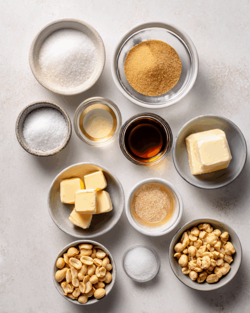 Simple Ingredients: No fancy, hard-to-find ingredients here. Granulated sugar, brown sugar, corn syrup, butter, peanuts, and a few extra touches create magic.