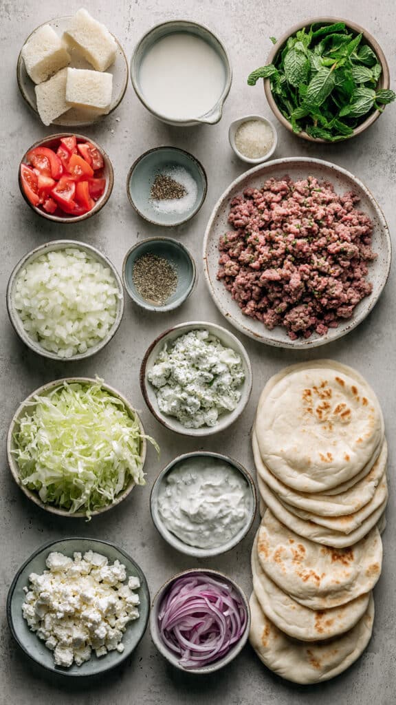 Mix the bread and milk until softened, then gently combine with shallots, garlic, mint, oregano, salt, pepper, and lamb. -