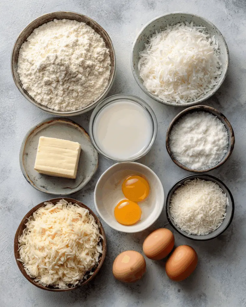 Uses simple ingredients you likely already have: mochiko flour, sugar, eggs, coconut, and butter.