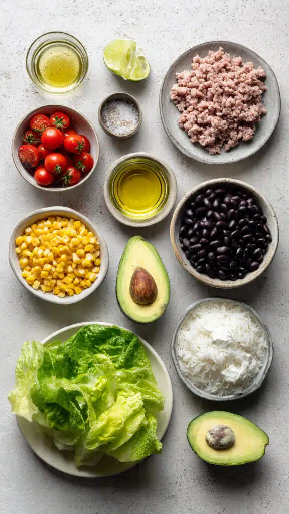 - Assemble the bowls by layering cooked rice, seasoned turkey, black beans, corn, shredded romaine lettuce, cherry tomatoes, and sliced avocado.