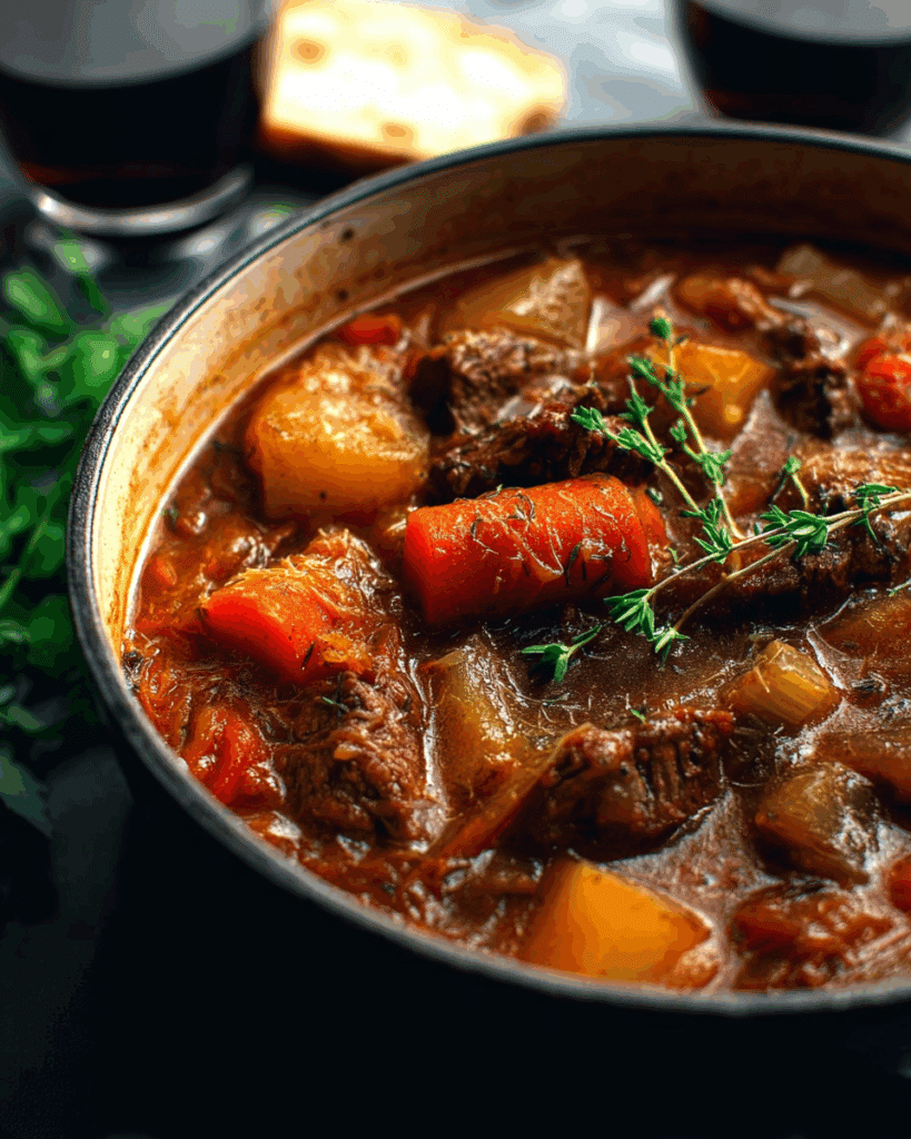 - Deglaze: Pour in the red wine, scraping up any browned bits from the bottom of the pot. Let simmer for 2–3 minutes to reduce slightly.
