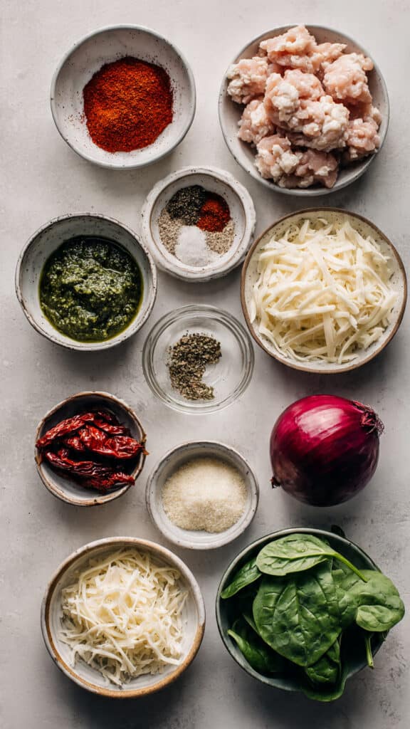 - Combine Ingredients: In a skillet over medium heat, cook ground chicken with paprika, garlic powder, onion powder, Italian seasoning, salt, and black pepper until fully cooked. Stir in pesto, spinach, red onion, and sun dried tomatoes. Cook until spinach wilts. Remove from heat and let cool slightly.