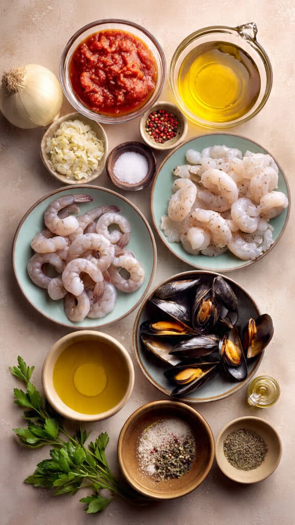 A rustic Italian seafood soup featuring shrimp, mussels, white fish, and calamari simmered in a rich tomato and seafood stock broth with garlic, oregano, and a touch of red pepper heat.