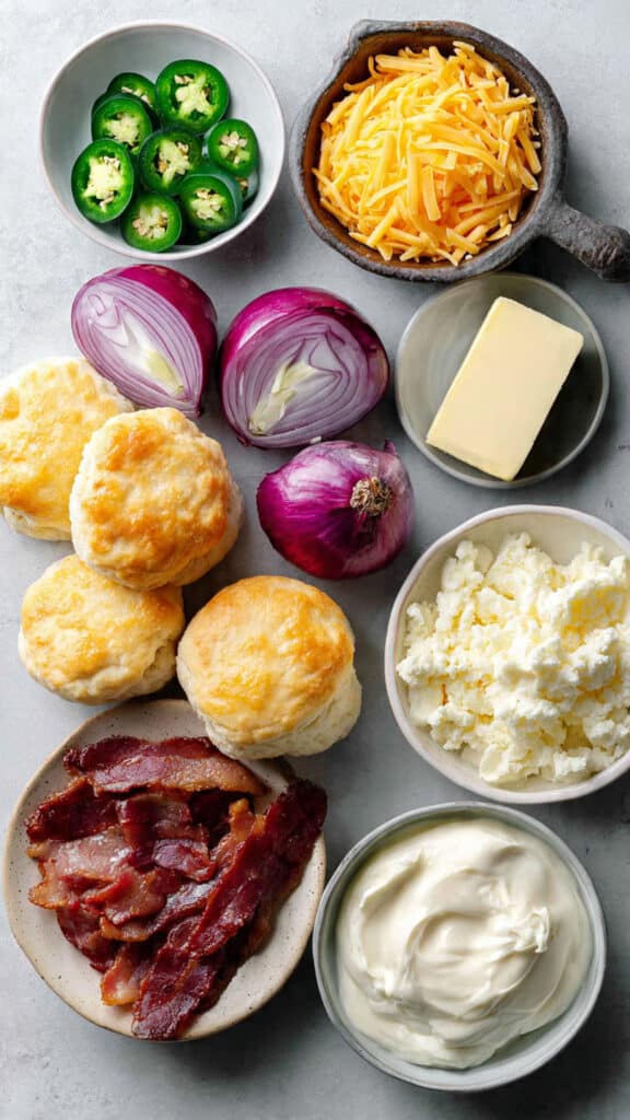 This recipe was born on game day. I wanted something easy, cheesy, and guaranteed to get devoured. I had jalapeños, leftover cooked bacon, and a can of biscuits—so I started experimenting. Mixing those popper ingredients into biscuit dough and baking it all into a bundt pan turned out to be one of the most addictive things I’ve ever made. And that red onion? A little unexpected, but it adds just the right punch.