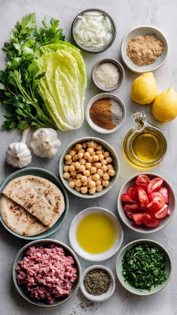 Ingredients in Lamb Kofta with Fattoush Salad and Hummus