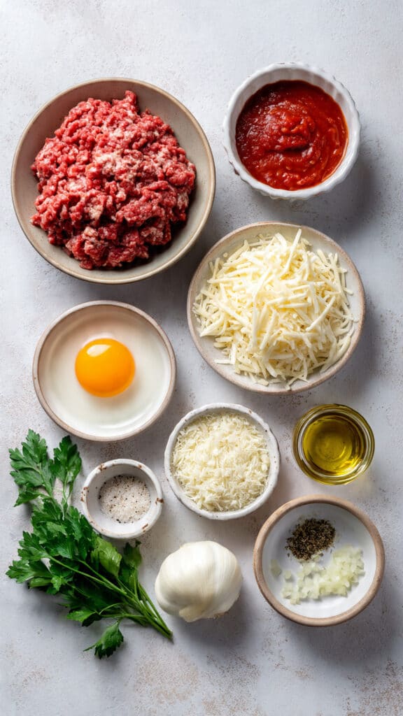 - Mozzarella Cheese: 1/2 cup shredded, adds melty moisture inside the meatballs.