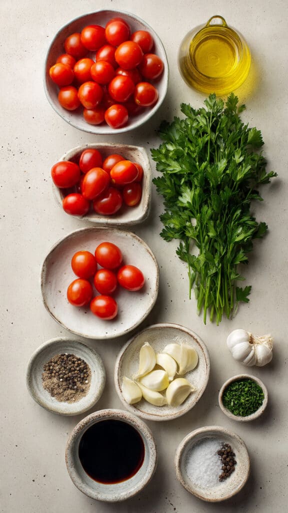 - Combine Ingredients: In a large mixing bowl, add the halved cherry tomatoes, olive oil, red wine vinegar, minced garlic, chopped parsley, salt, and black pepper.