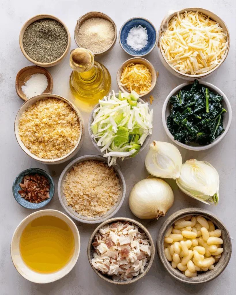 Olive oil, butter, chopped celery, sliced fennel bulb, minced garlic, white wine, chicken stock, chopped kale, crumbled cooked bacon, soy sauce, salt, dried thyme, pepper. This combination creates a savory, aromatic broth packed with layers of flavor.