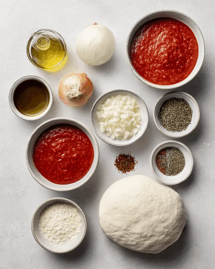 Prepare the Sauce: Heat olive oil in a skillet over medium heat. Add the onion and sauté until softened, then add garlic and cook until fragrant. Stir in tomato sauce, tomato paste, pizza seasoning, salt, and pepper. Simmer gently for 10 minutes until thickened and flavorful.