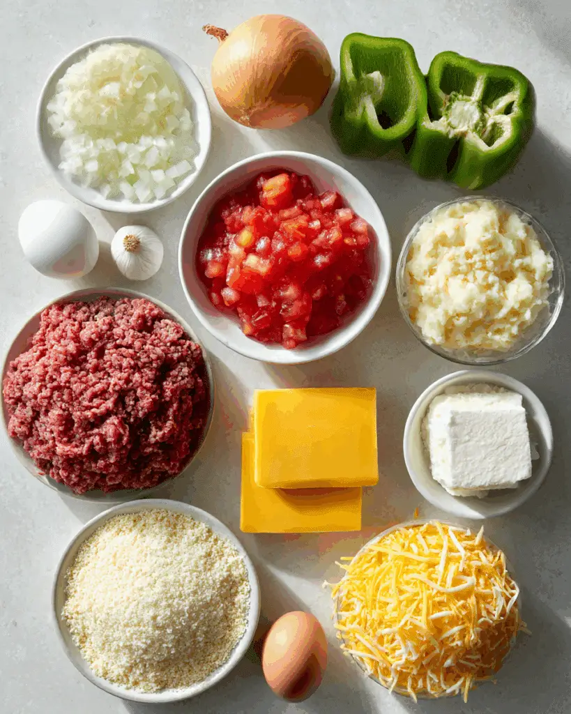 - In a large bowl, combine ground beef, chopped onion, diced bell pepper, diced tomato, egg, garlic, and seasoned bread crumbs. Mix until well combined.