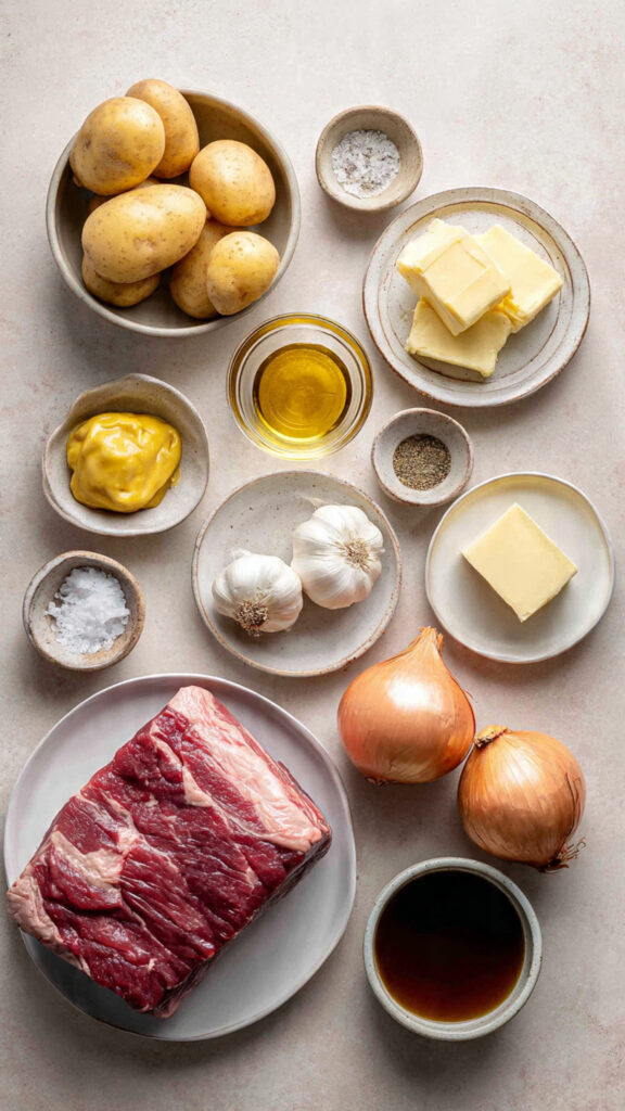 This dish is all about contrasts. The brisket is deeply savory, tender, and infused with tangy mustard and sweet onions. The sauce thickens naturally in the oven, creating a glossy glaze. The mashed potatoes are soft, buttery, and soak up every drop of the sauce like a sponge.