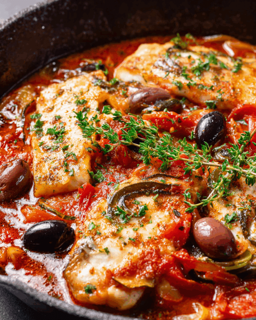 One-Skillet Fish Provençal is proof that simple ingredients can deliver extraordinary flavors. With tender, flaky fish, a rich, aromatic tomato sauce, briny olives, and bright herbs, this dish is both comforting and elegant. It’s perfect for weeknight dinners, romantic meals, or casual entertaining. Minimal cleanup, maximum flavor—what more could you ask for?