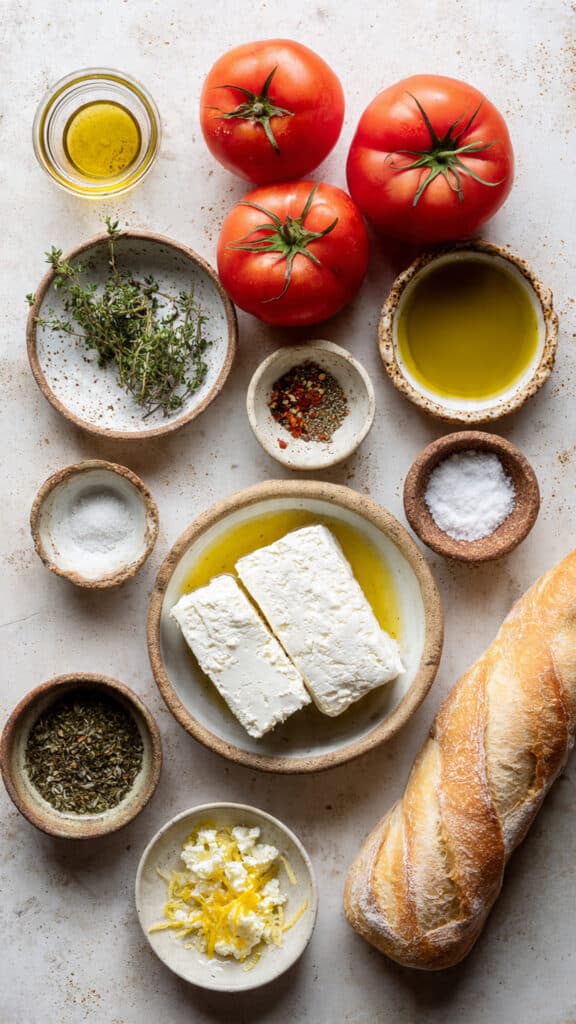 Ingredients in Oven-dried Tomatoes, Whipped Feta on a Crusty Baguette