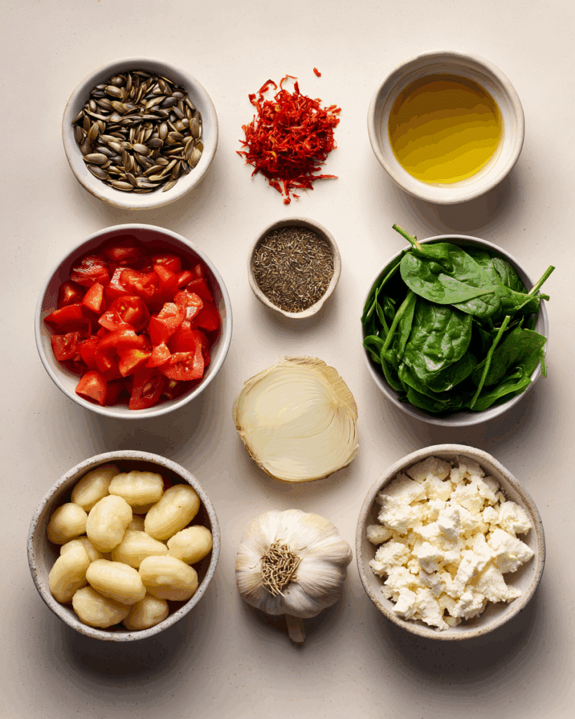 Ingredients in Pan Fried Gnocchi with Feta, Fennel Seeds, and Toasted Pine Nuts