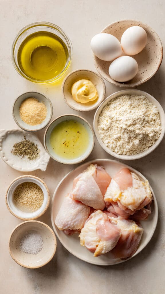 - Chicken Thighs: 3 lb boneless, skinless. Juicy and rich, perfect for frying.