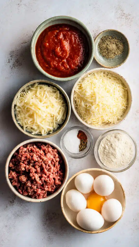 - Combine Ingredients: In a large bowl, mix ground beef, eggs, 1 cup of shredded mozzarella, grated Parmesan, 1/2 cup marinara sauce, Italian seasoning, garlic powder, onion powder, salt, and black pepper until just combined.