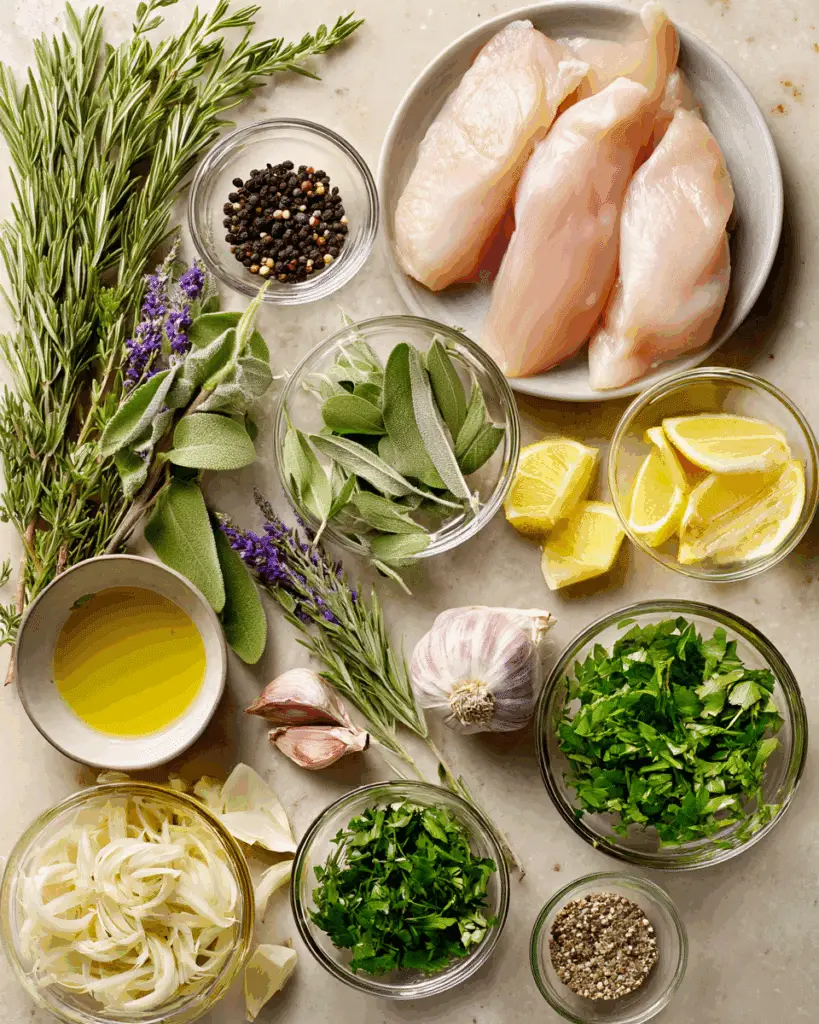 Ingredients in Poached Chicken Breasts with Lemon-Herb Dressing