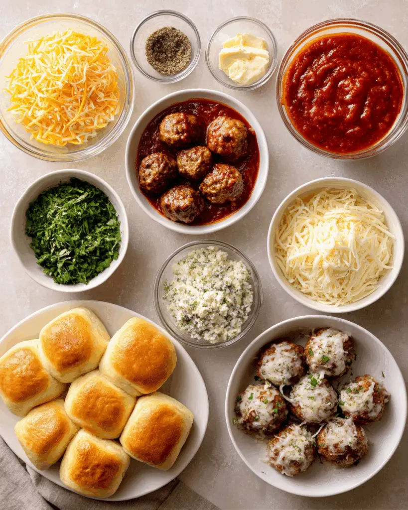 Soft pull-apart sliders filled with tender meatballs, warm marinara, melty mozzarella, and a creamy herbed ricotta spread. Perfect for parties, game day, or a cozy family dinner.