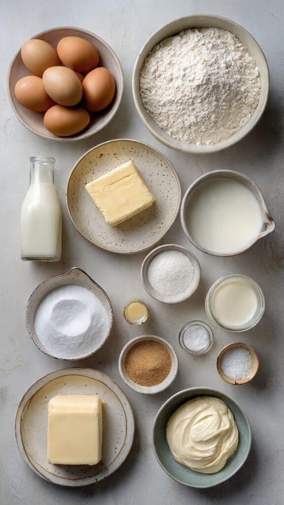 - Eggs: 2 large, at room temperature for structure and tenderness.