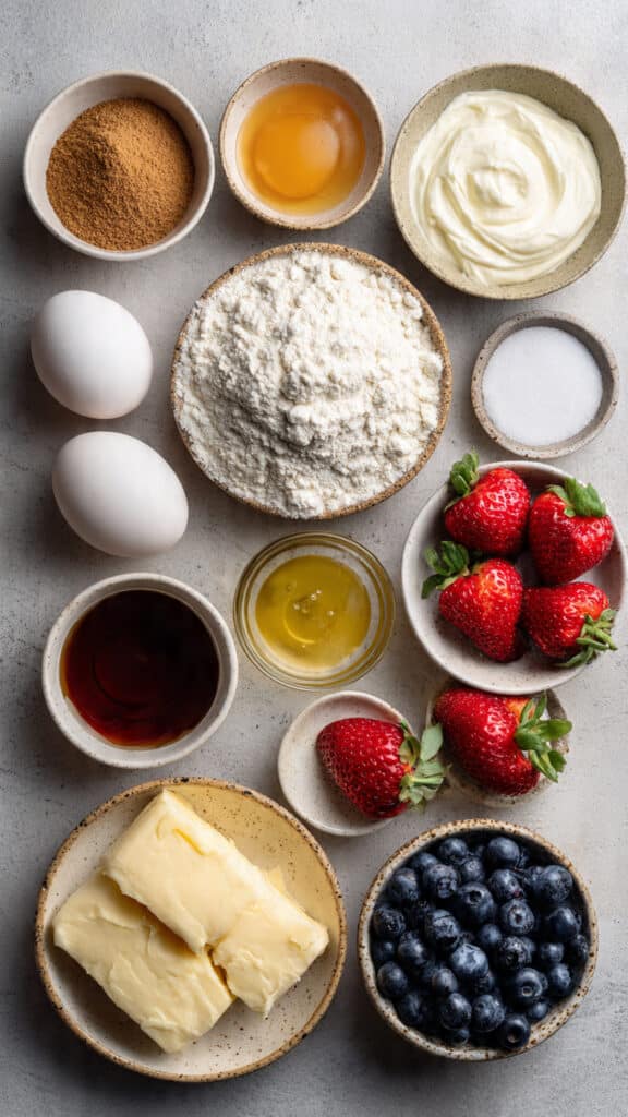 Fluffy, oven-baked pancakes made in a sheet pan, topped with fresh strawberries, blueberries, and a sweet cinnamon sugar crust. Perfect for an easy and crowd-pleasing breakfast.