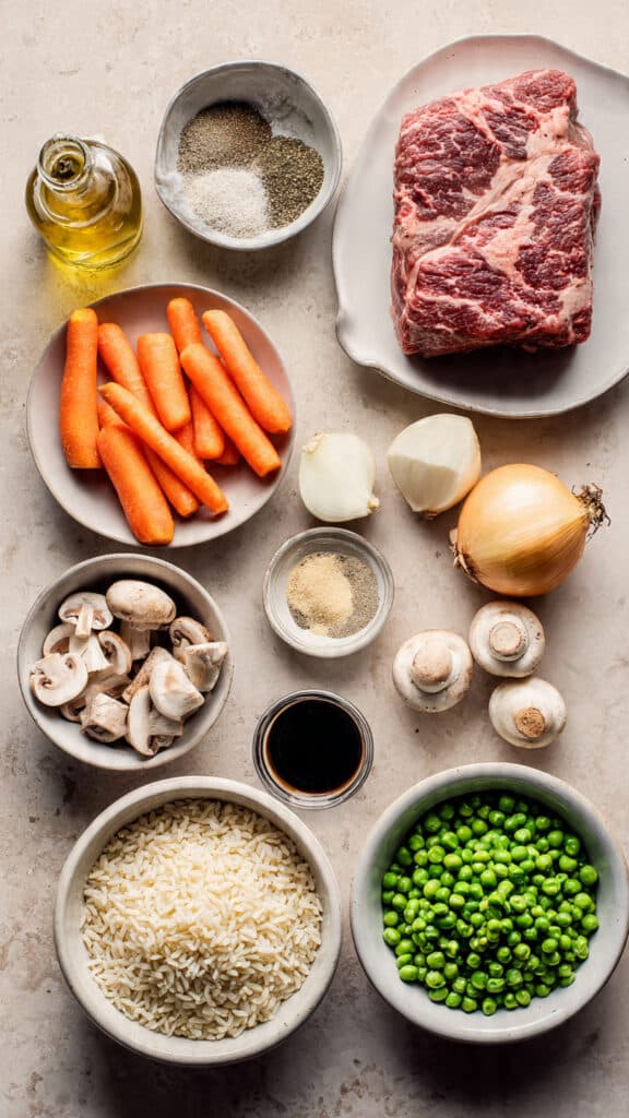 The beef turns melt-in-your-mouth tender while the rice soaks up all that savory broth, becoming rich and flavorful. The carrots stay slightly sweet, the mushrooms earthy, and the peas add a final burst of freshness. Every spoonful tastes like comfort and care.
